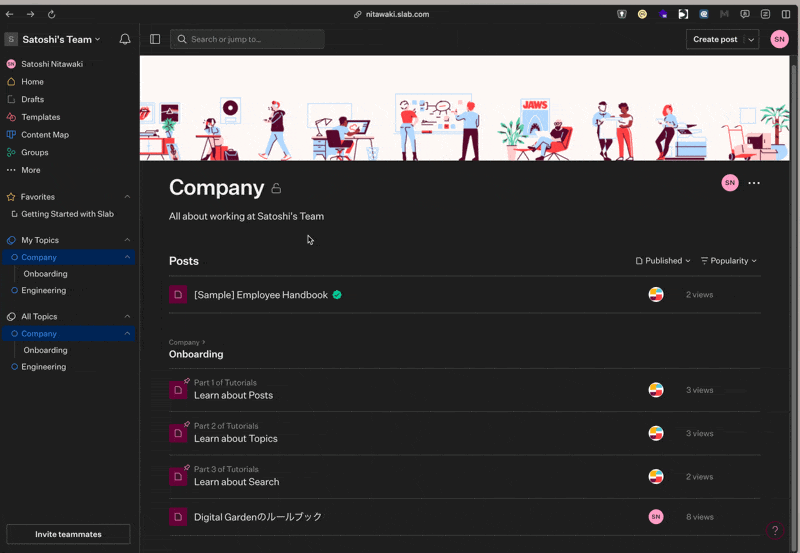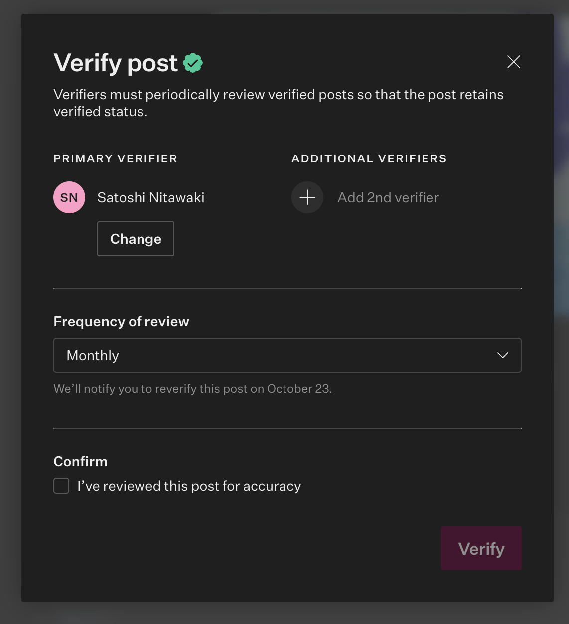 古いドキュメントかどうか検証する仕組みとして Verification がある。検証期間が過ぎると記事に表示され、検証者に通知が行くというもの。素晴らしい。Notionで運用していたらよく発生していたので、助かる。